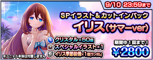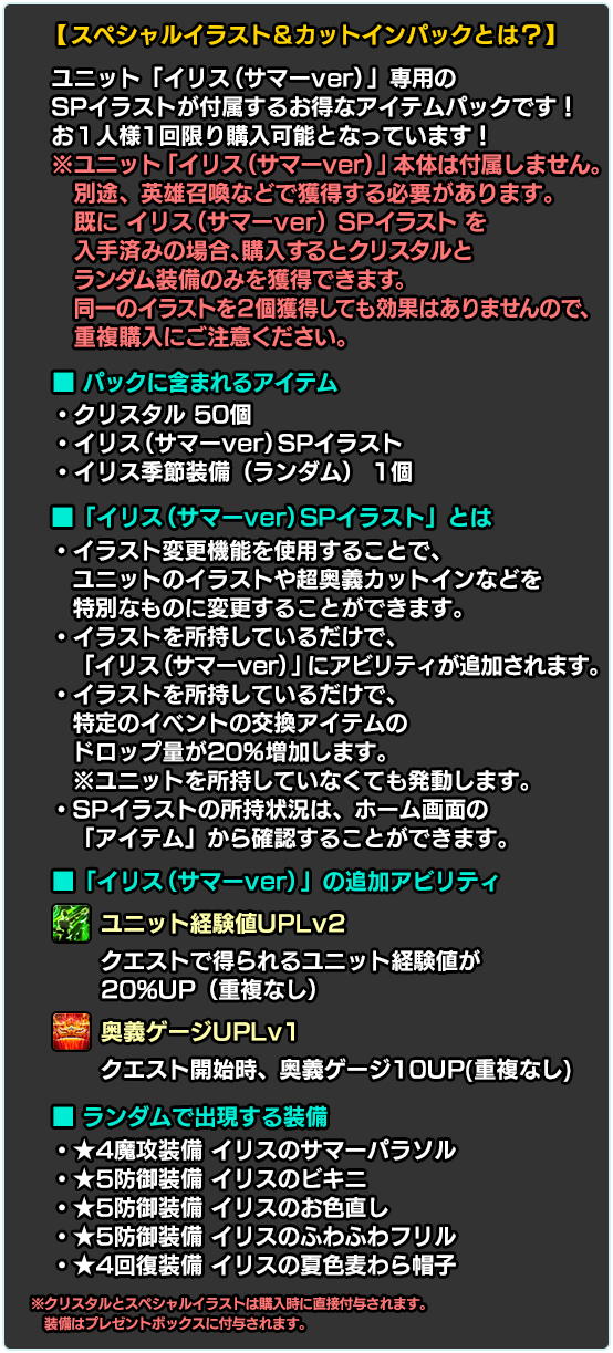 ※スペシャルイラスト獲得後のイラスト変更機能や追加アビリティ効果発動の対象は『イリス(サマーver)』のみとなります。『イリス(初期)』『イリス(コラボ)』は対象外となりますのでご注意ください。