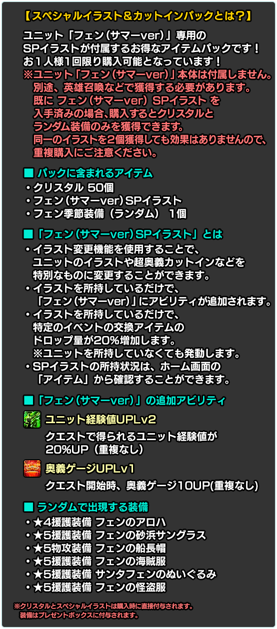 ※スペシャルイラスト獲得後のイラスト変更機能や追加アビリティ効果発動の対象は『フェン(サマーver)』のみとなります。『フェン(初期)』『フェン(闇)』『軍神フェン』は対象外となりますのでご注意ください。