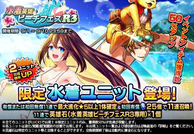 下記の期間、『フェン(サマーver)』『イリス(サマーver)』が登場する『水着英雄ビーチフェスR3』を開催いたします。