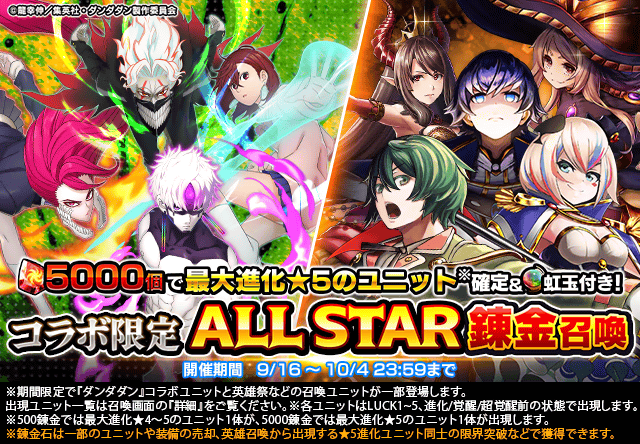 初回無償11連で最大進化★5以上1体確定!『超降臨祭×ダンダダン 後編』