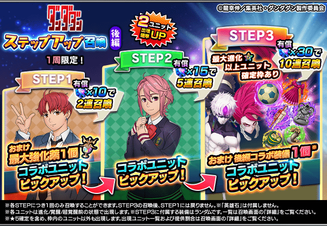 『ダンダダン』ステップアップ召喚は回数により内容が変化する英雄召喚です。