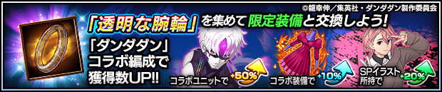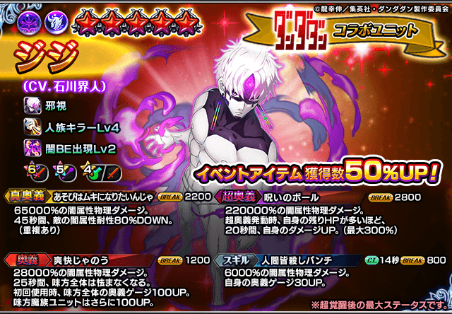 また、『ダンダダン』コラボユニット・コラボ装備を編成することによりコラボイベントクエストの交換アイテムの獲得数がUP!イベントを有利に進めることができるようになりますので、ぜひこの機会にご利用ください。
