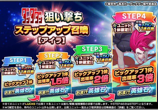 ※『狙い撃ちステップアップ召喚』に付属する英雄石は今回の『超降臨祭×ダンダダン(前編/後編/総集編)』と共通です。