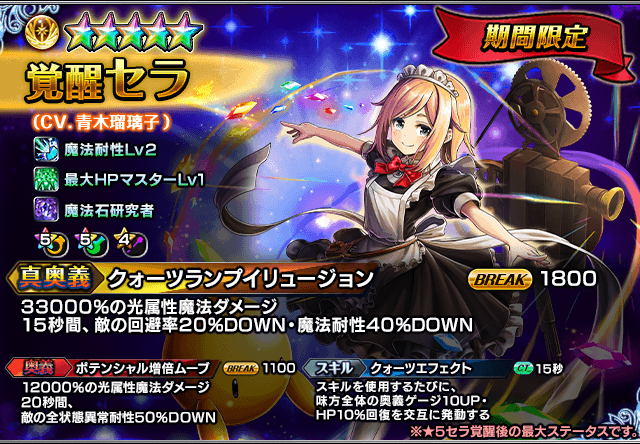※『剣鬼ベリック』『セティス(初期)』『ロゼッタ(樹)』『セラ』『アッシュ』はピックアップ対象ではありません。それぞれの出現確率は召喚画面の『詳細』をご覧ください。