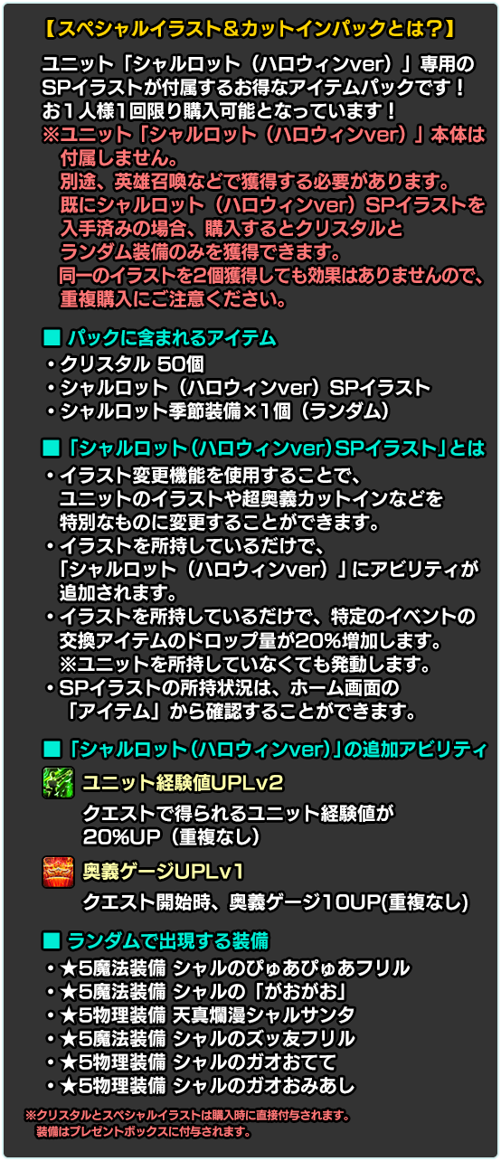 ※スペシャルイラスト獲得後のイラスト変更機能や追加アビリティ効果発動の対象は『シャルロット(ハロウィンver)』のみとなります。『シャルロット(初期)』、『熾炎の小隊長シャルロット』は対象外となりますのでご注意ください。