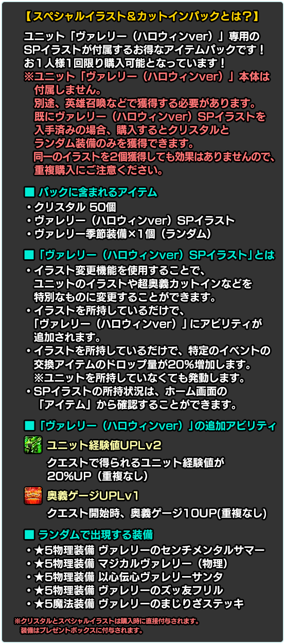 ※スペシャルイラスト獲得後のイラスト変更機能や追加アビリティ効果発動の対象は『ヴァレリー(ハロウィンver)』のみとなります。『ヴァレリー(初期)』、『星剣使いヴァレリー』は対象外となりますのでご注意ください。
