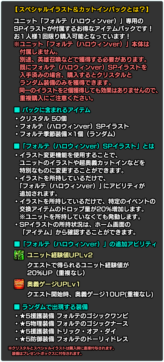 ※スペシャルイラスト獲得後のイラスト変更機能や追加アビリティ効果発動の対象は『フォルテ(ハロウィンver)』のみとなります。『フォルテ(初期)』は対象外となりますのでご注意ください。
