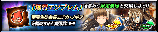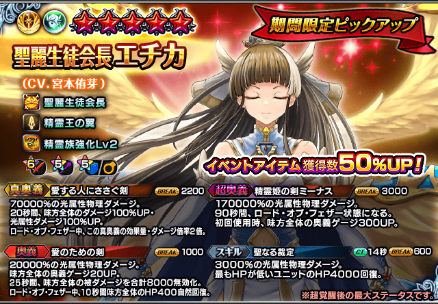 また、『聖麗生徒会長エチカ』を編成することにより大型イベント「ミーナ・ソアーズ・ハイ 第五章 『二重罰の宝石』」交換アイテムの獲得数がUP!イベントを有利に進めることができるようになりますので、ぜひこの機会にご利用ください。