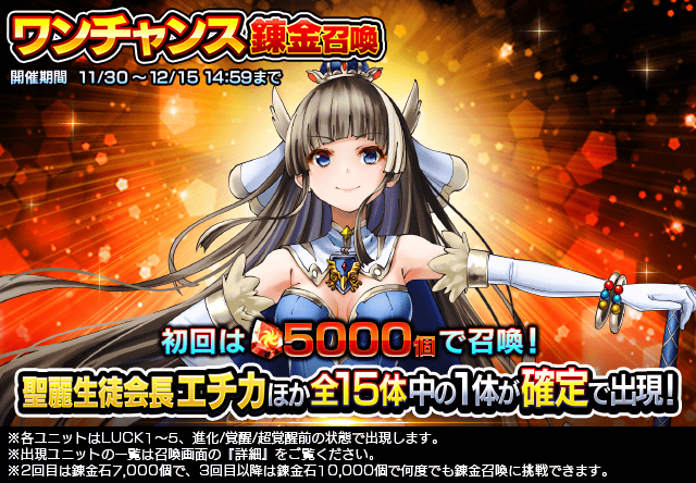 下記の期間、超覚醒ユニット『聖麗生徒会長エチカ』が登場する『超降臨祭』と『ワンチャンス錬金召喚』を開催いたします。