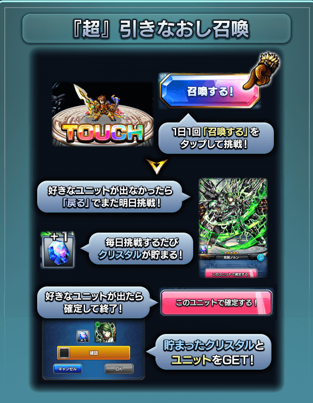 引きなおし召喚はクリスタルなしで1日1回チャレンジすることができ、『このユニットで確定する!』をタップすることでユニットを獲得できる召喚です。