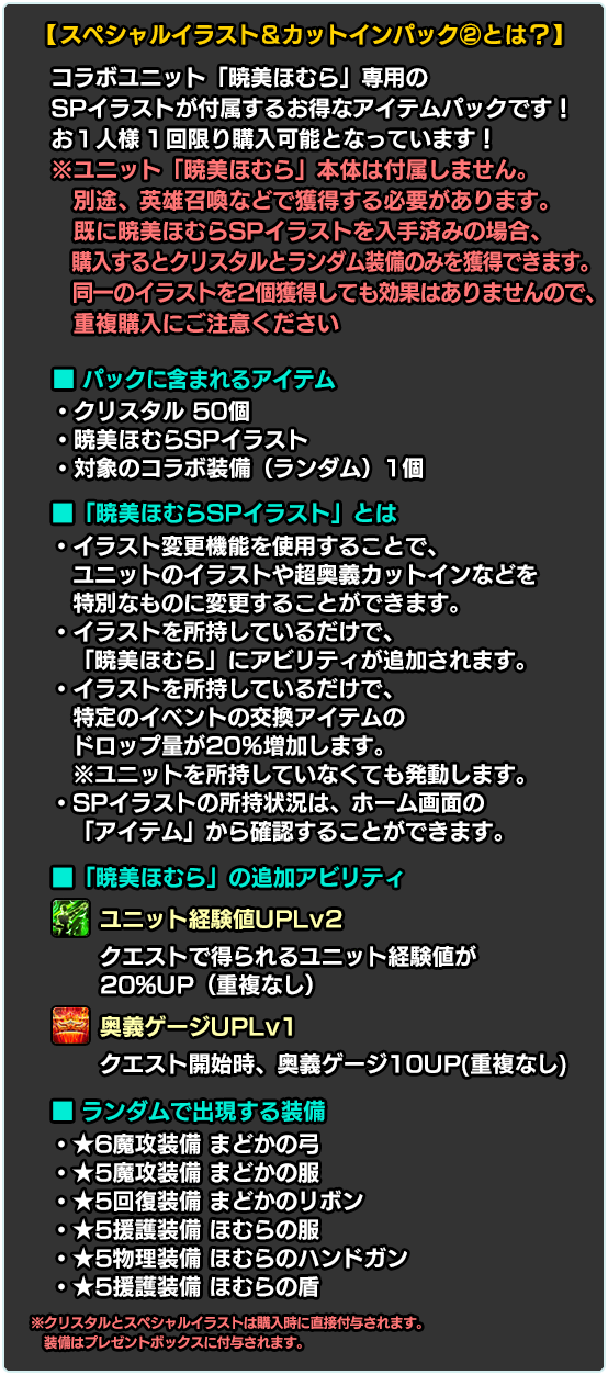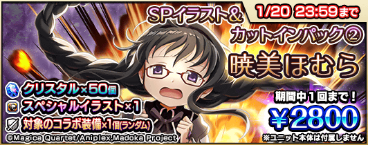 アニメ「魔法少女まどか☆マギカ」コラボの開催に伴い、『鹿目まどか』『暁美ほむら』のスペシャルイラスト入りのパックや、クリスタルなどがセットになった『コラボ記念パック』4種を販売します。