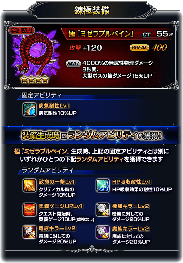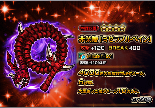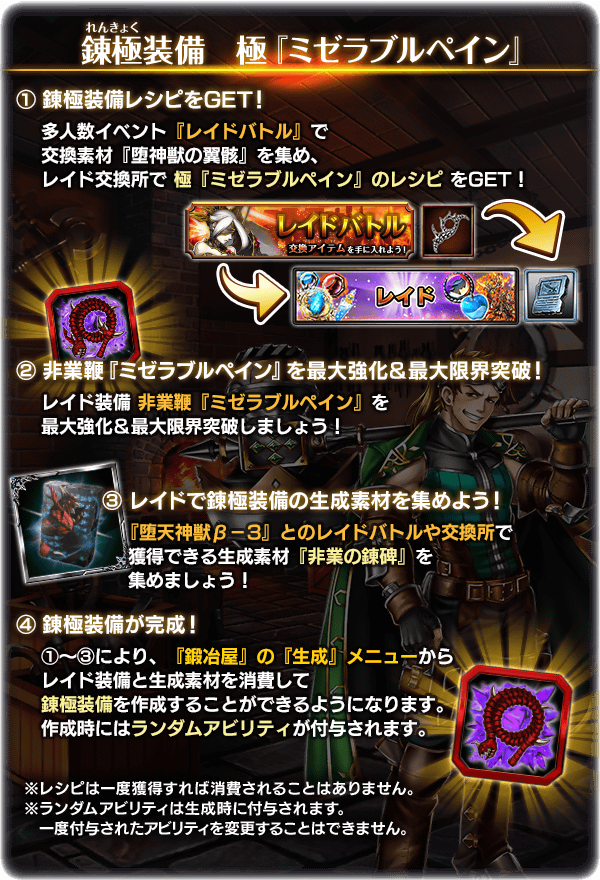 堕天神獣β-3の装備 非業鞭『ミゼラブルペイン』を錬極化できるようになります。