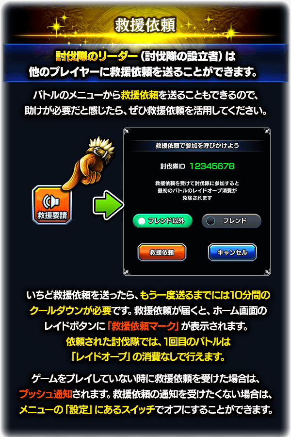 - 討伐隊リーダーは、フレンドやフレンド以外のプレイヤーに「救援依頼」を送ることができます。救援依頼を受けて参加すると、最初のバトルはレイドオーブの消費なしでバトルを行うことが可能です。