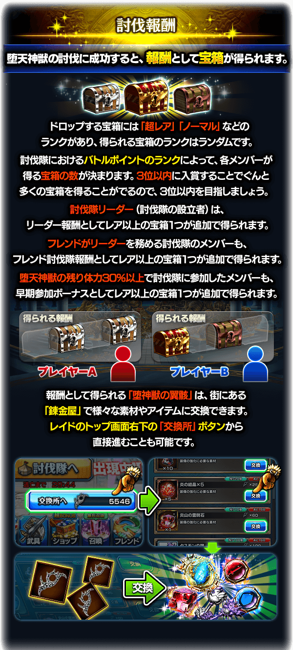 - 他のプレイヤーと協力してレイドバトルを行い、ドロップするアイテム『堕神獣の翼骸』を豪華アイテムと交換しましょう。交換所ではユニット限界突破石や覚醒魂などを獲得できます。