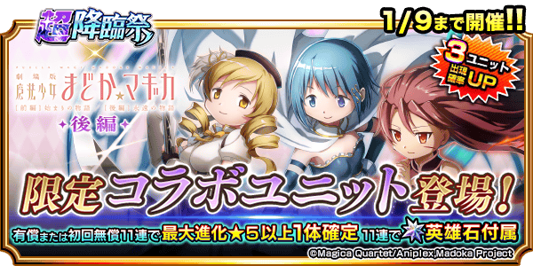 初回無償11連で最大進化★5以上1体確定!『超降臨祭×魔法少女まどか☆マギカ 後編』