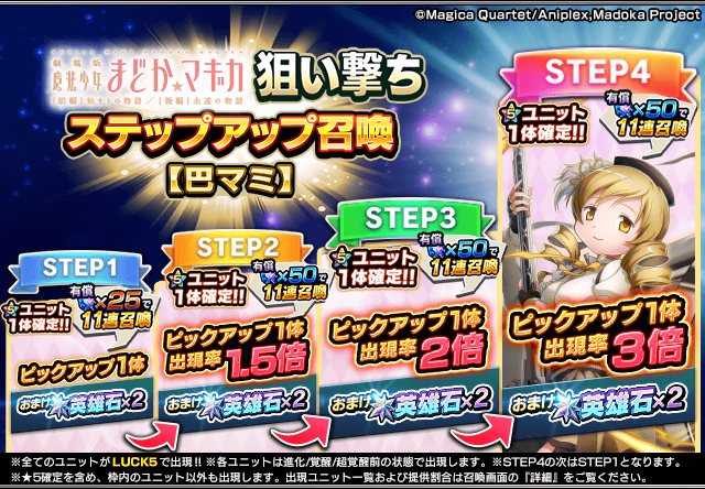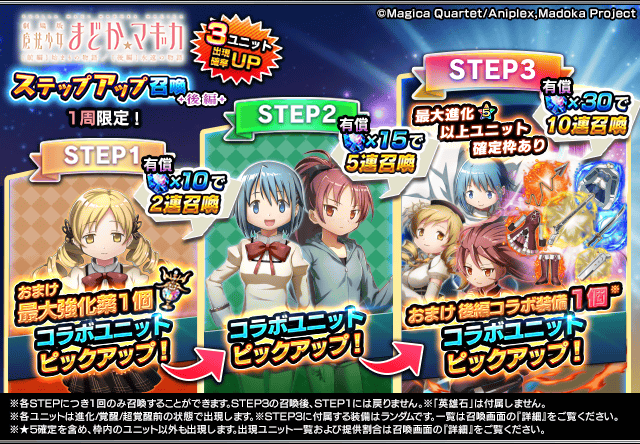 『魔法少女まどか☆マギカ』ステップアップ召喚は回数により内容が変化する英雄召喚です。