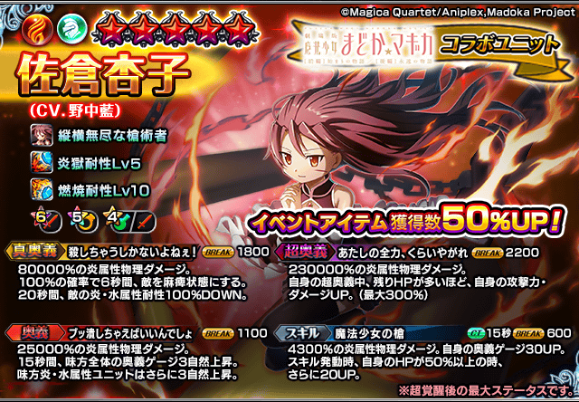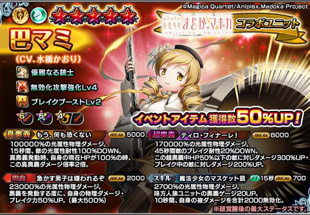 また、コラボユニット3体(『巴マミ』『美樹さやか』『佐倉杏子』)が他の最大進化★5以上ユニットよりも高確率で出現します。