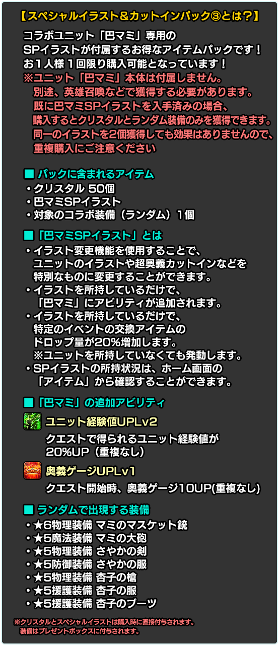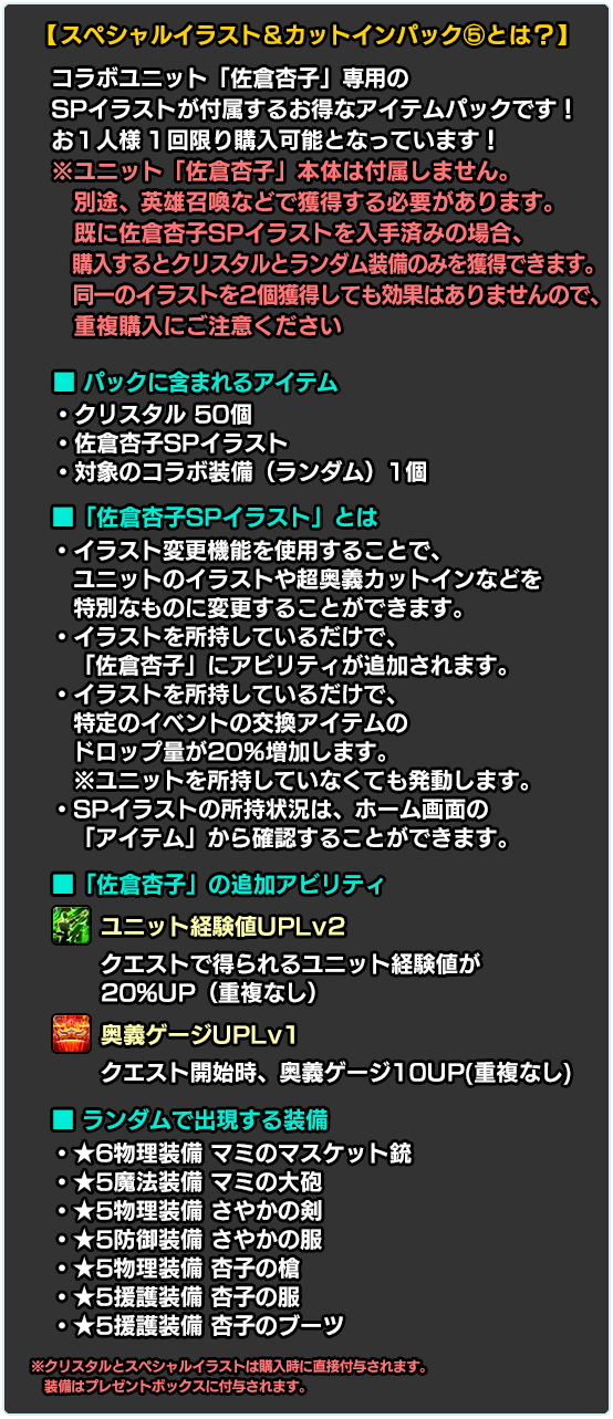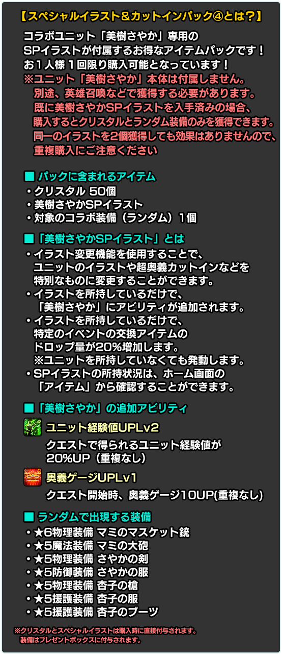 ※別途購入により既に入手済みの場合、再度購入するとクリスタルとランダム装備のみを獲得できます。同一のイラストを2個獲得しても効果はありませんので、重複購入にご注意ください。