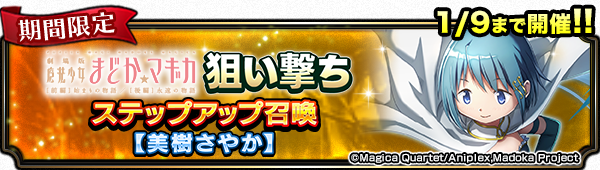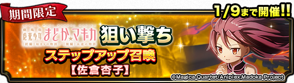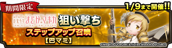 下記の期間、コラボユニット『巴マミ』『美樹さやか』『佐倉杏子』が登場する狙い撃ちステップアップ召喚を開催いたします。