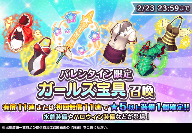 今回の『ガールズ宝具召喚』では特定の水着装備やハロウィン装備、クリスマス装備などが登場し、期間中の"有償"11連召喚では★5装備が1個確定となります。
