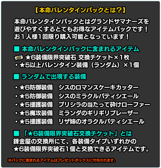 『本命バレンタインパック』は★6装備限界突破石交換チケットが1枚入手できるほか、★5以上バレンタイン装備がランダムで1種付属するパックとなっておりますので、