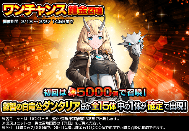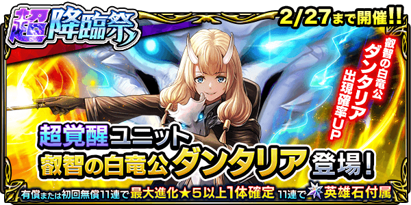 下記の期間、超覚醒ユニット『叡智の白竜公ダンタリア』が登場する『超降臨祭』と『ワンチャンス錬金召喚』を開催いたします。