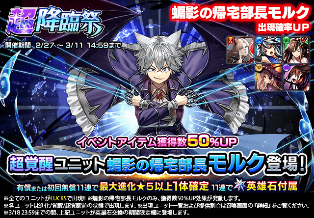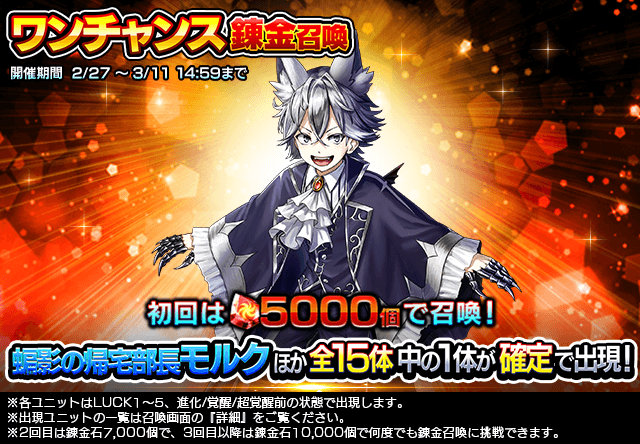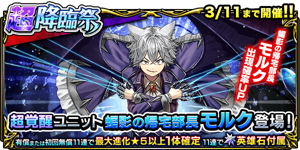 下記の期間、超覚醒ユニット『蝙影の帰宅部長モルク』が登場する『超降臨祭』と『ワンチャンス錬金召喚』を開催いたします。