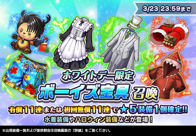 下記の期間、ホワイトデーキャンペーンとして期間限定の宝具召喚『ボーイズ宝具召喚』を開催いたします。