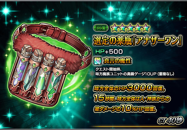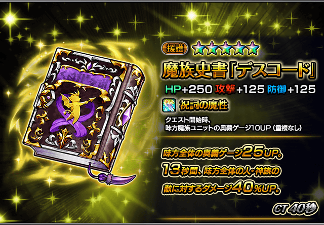 例)『魔族の遺跡』限定装備5種類を編成した場合、味方魔族ユニットの奥義ゲージが50UPします。