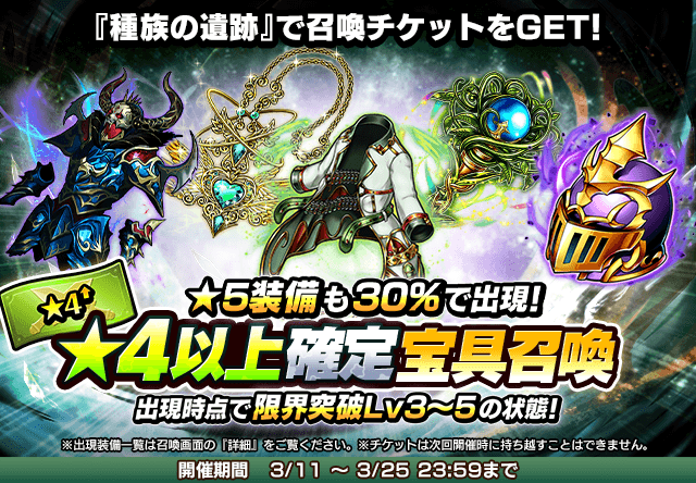 ※チケットは他の「種族の遺跡」BOX装備召喚と共通です。またチケットの期限は無期限です。