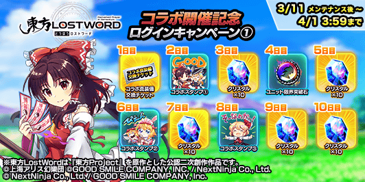 「東方LostWord」とのコラボ前編開催を記念し、下記の期間、ログインキャンペーンを開催します。