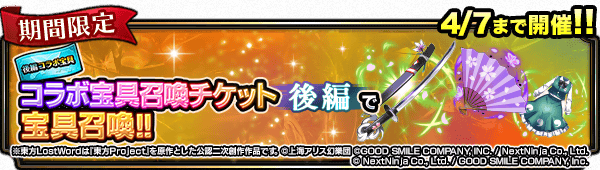 下記の期間、「東方LostWord」コラボ限定ピックアップ宝具召喚 後編を開催します。