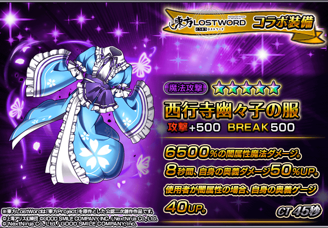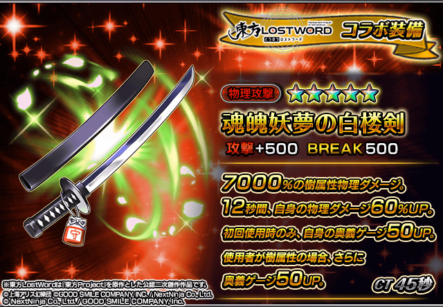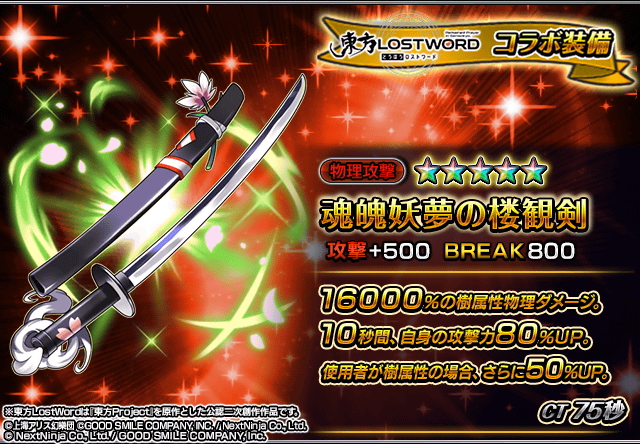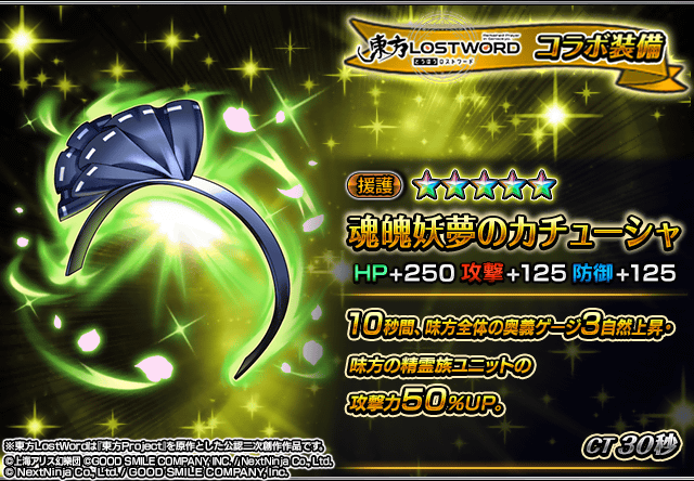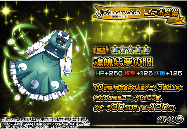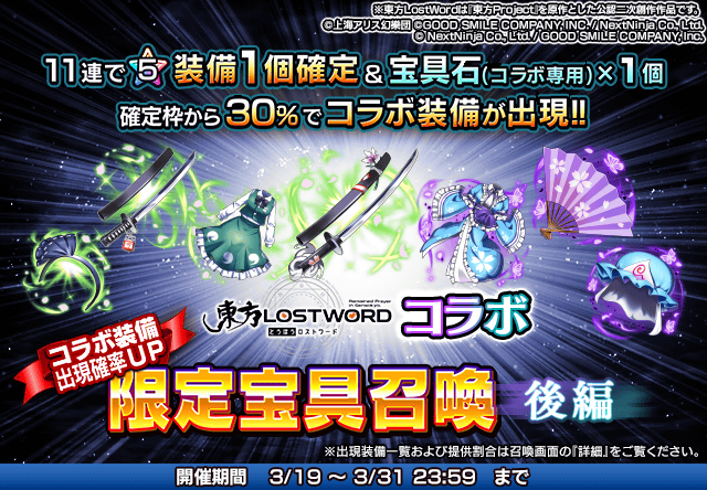 また、『東方LostWord』コラボユニット・コラボ装備を編成することによりコラボイベントクエストの交換アイテムの獲得数がUP!イベントを有利に進めることができるようになりますので、ぜひこの機会にご利用ください。