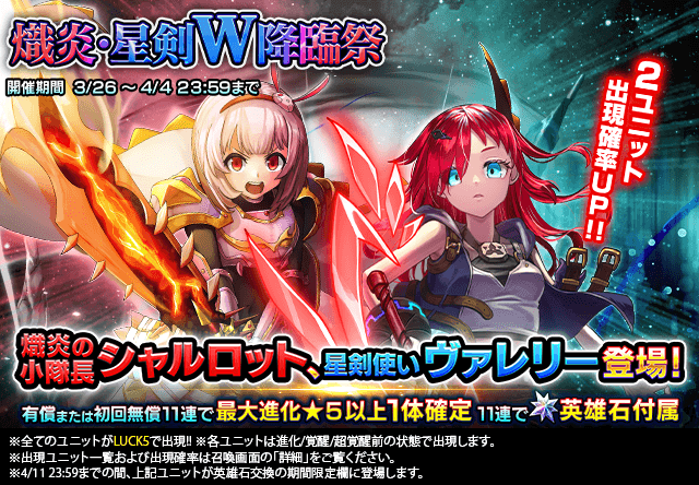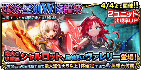 下記の期間、『熾炎の小隊長シャルロット』、『星剣使いヴァレリー』が登場する英雄召喚『熾炎・星剣W降臨祭』を開催します。