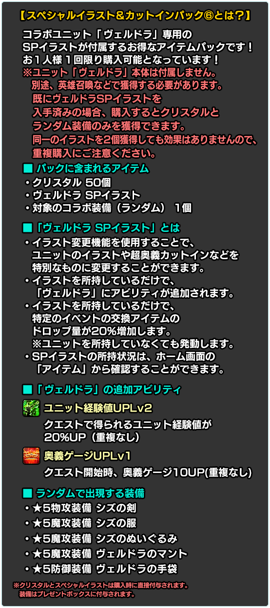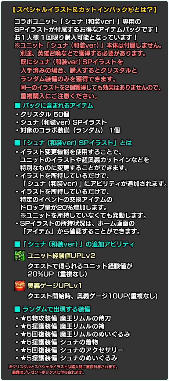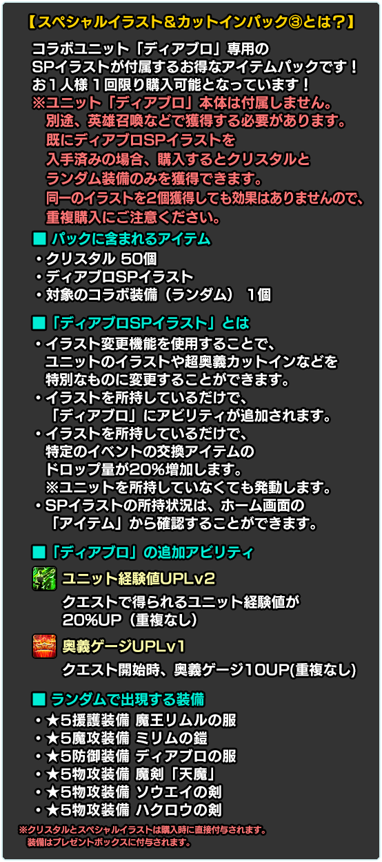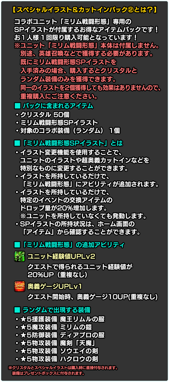 ※別途購入により既に入手済みの場合、再度購入するとクリスタルとランダム装備のみを獲得できます。同一のイラストを2個獲得しても効果はありませんので、重複購入にご注意ください。