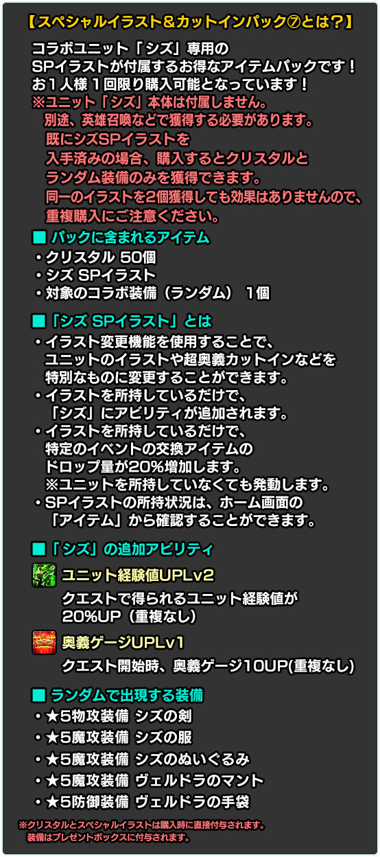 ※スペシャルイラスト①〜⑦は復刻販売となります。既に購入済みの場合、再度購入するとクリスタルとランダム装備のみを獲得できます。同一のイラストを2個獲得しても効果はありませんので、重複購入にご注意ください。
