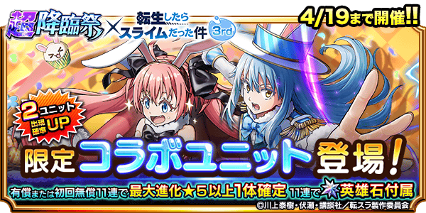 下記の期間、新コラボユニットが登場する英雄召喚『超降臨祭×転生したらスライムだった件』3rdを開催します。