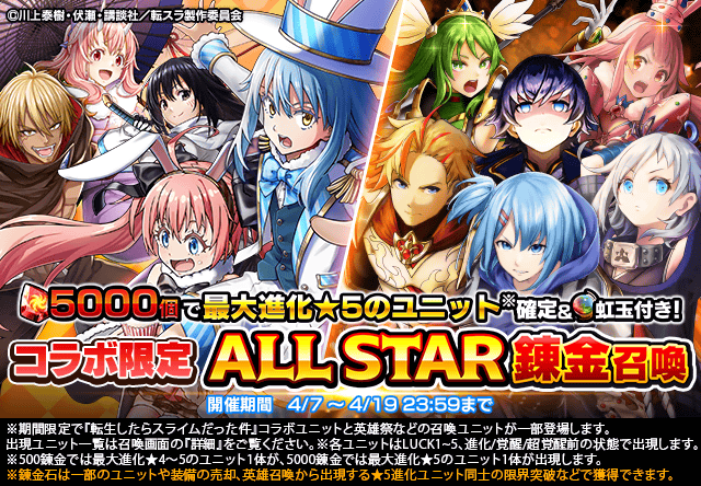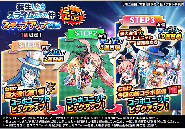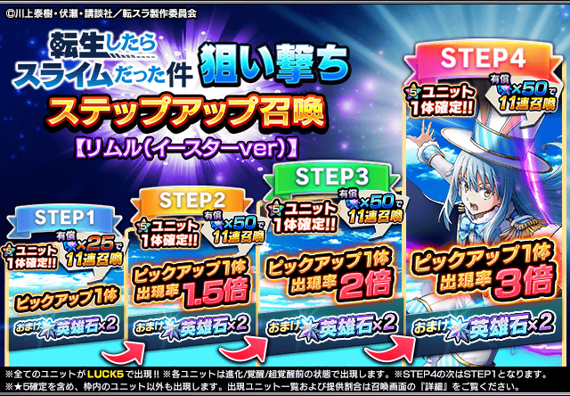 また、コラボユニット2体(『リムル(イースターver)』『ミリム(イースターver)』)が他の最大進化★5以上ユニットよりも高確率で出現します。