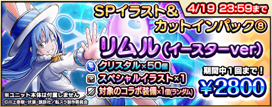 コラボ英雄召喚の開催に合わせ、『リムル(イースターver)』『ミリム(イースターver)』のスペシャルイラスト入りのパックの販売を開始します。