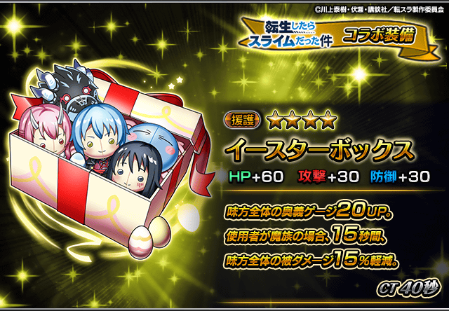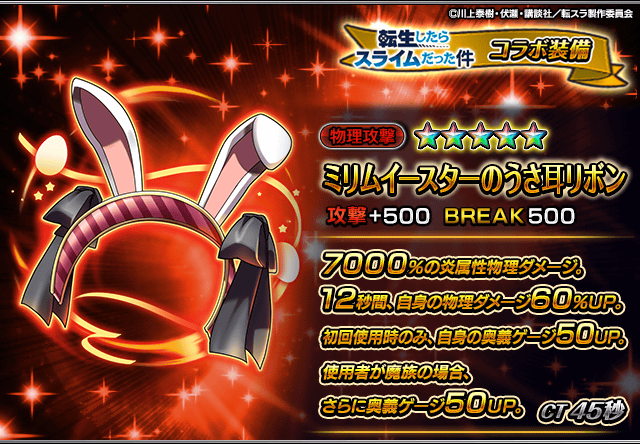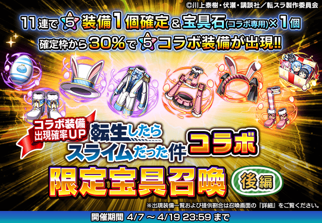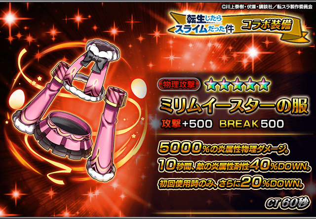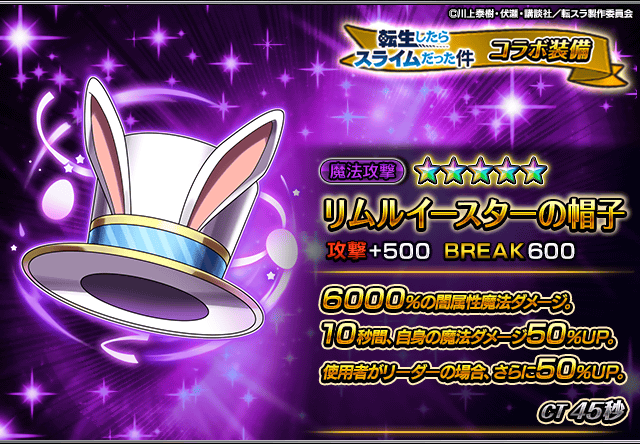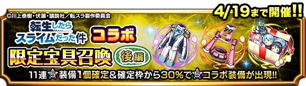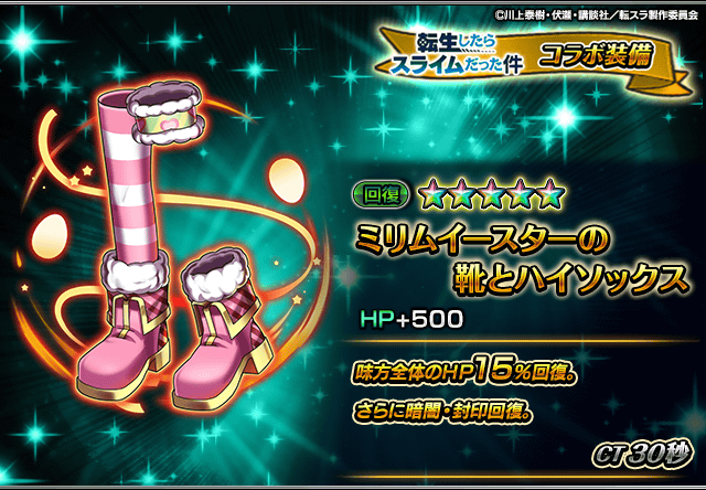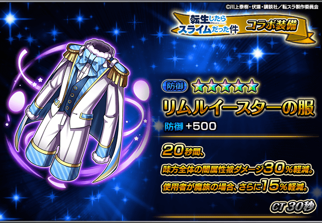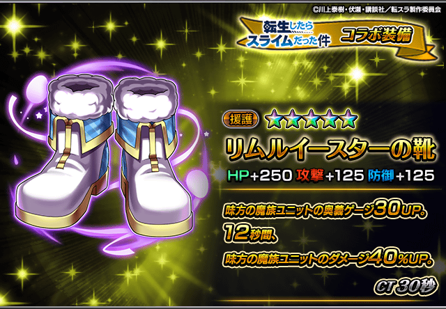 また、『転生したらスライムだった件』コラボユニット・コラボ装備を編成することによりコラボイベントクエストの交換アイテムの獲得数がUP!イベントを有利に進めることができるようになりますので、ぜひこの機会にご利用ください。