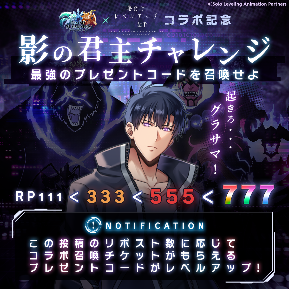 さらに、4/18(土)13:00からは、キャンペーン投稿のリポスト数に応じてコラボ召喚(ガチャ)チケットがもらえるキャンペーン「影の君主チャレンジ」も開催予定!